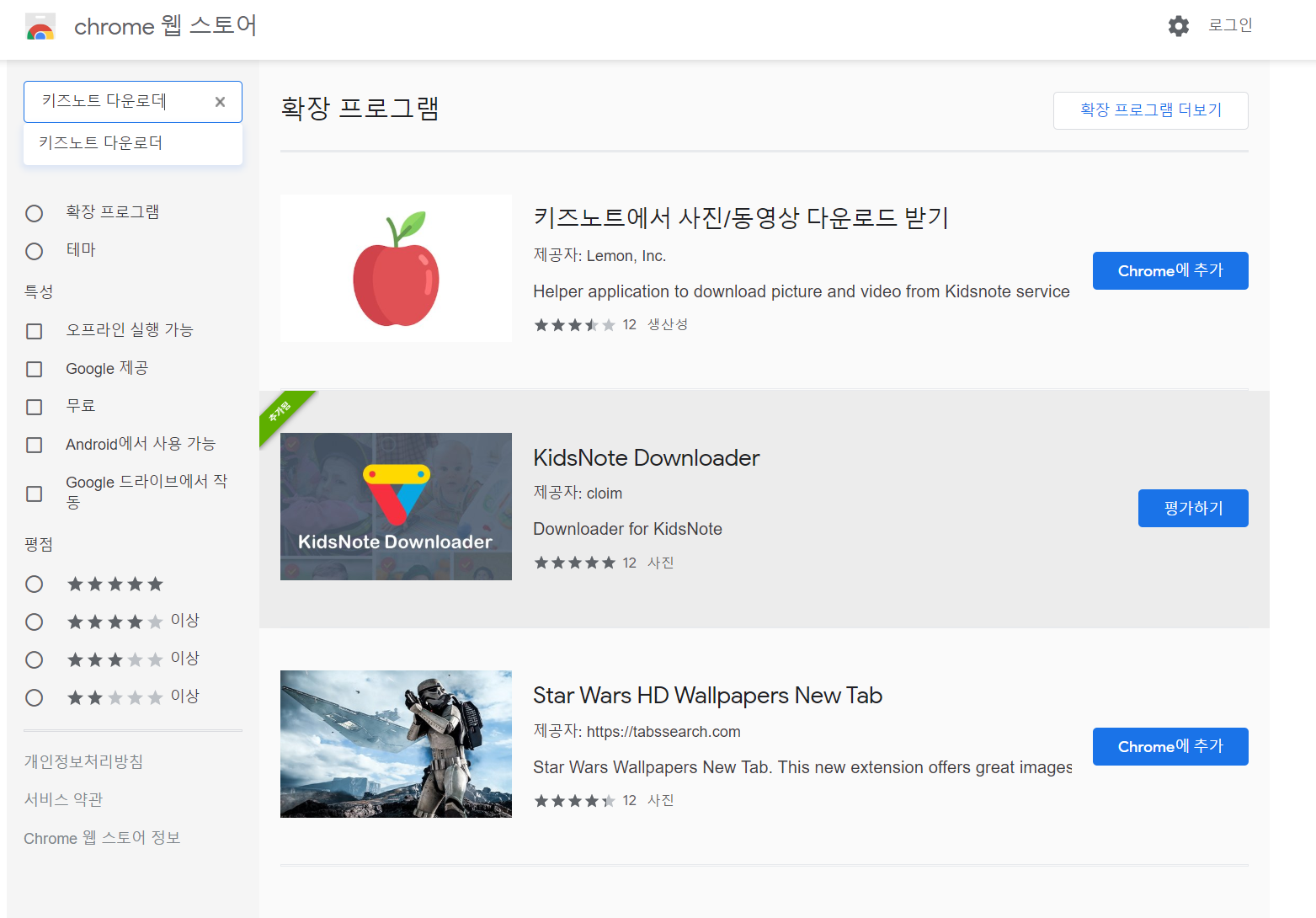 크롬 웹스토어에서 '키즈노트 다운로더'를 검색한다.