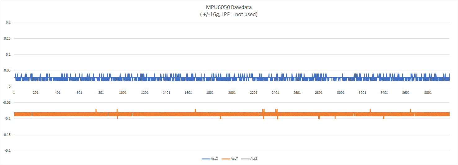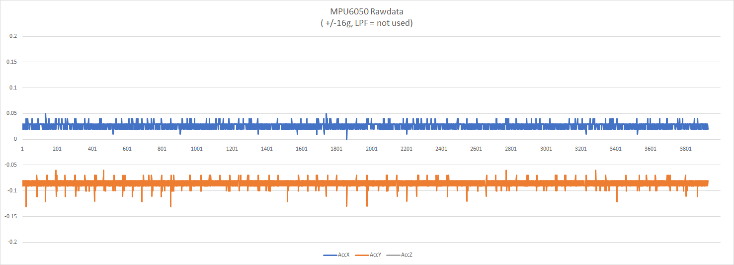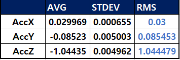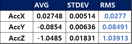 AccX, AccY, AccZ의 평균값은 거의 0g, 0g, -1g 즉, 지면에 수평으로 누워져 있는 상태를 표시하고 있다. 표준편자(STDEV)를 보면 0.05이하로 데이터시트에서 제시한 수준으로 측정됨을 알 수 있다. 굉장히 적은 편이다.