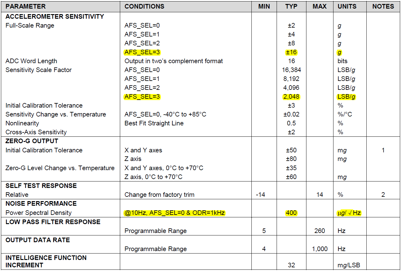 Sensitivity는 ADC Resolution을 Full-Scale로 나눈 것이다. 65536/32 = 2048 LSB/g이므로 1g는 ADC의 2048 LSB에 해당된다는 의미이다.