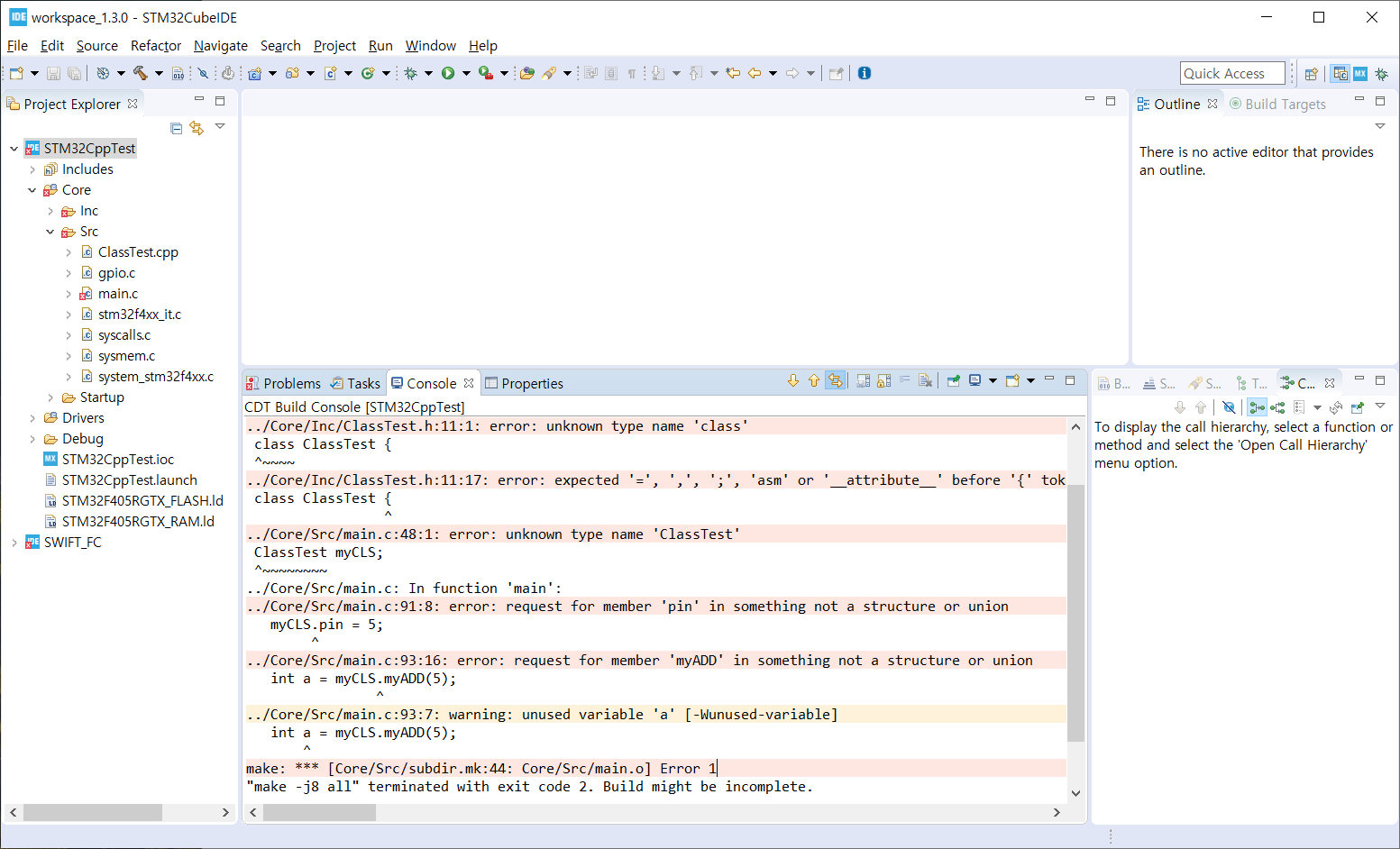 | ../Core/Inc/ClassTest.h:11:1: error: unknown type name 'class' class ClassTest { ^~~~~ ../Core/Inc/ClassTest.h:11:17: error: expected '=', ',', ';', 'asm' or '__attribute__' before '{' token class ClassTest { ^ ../Core/Src/main.c:48:1: error: unknown type name 'ClassTest' ClassTest myCLS; |