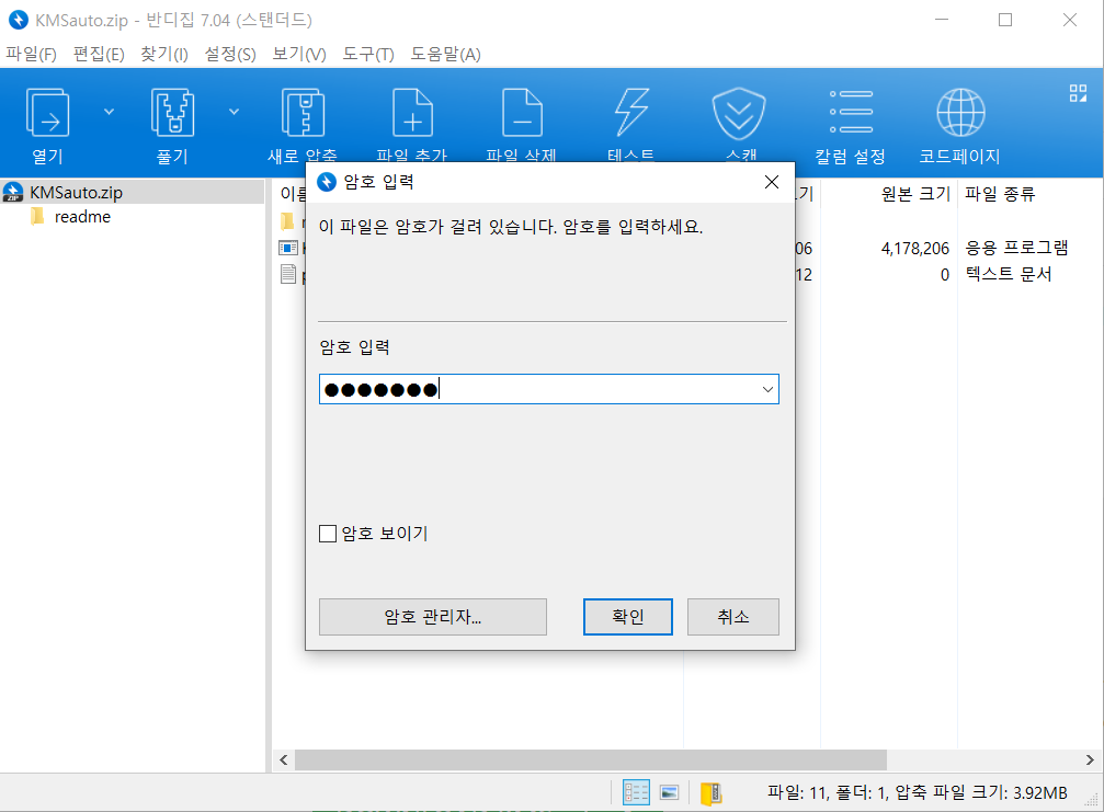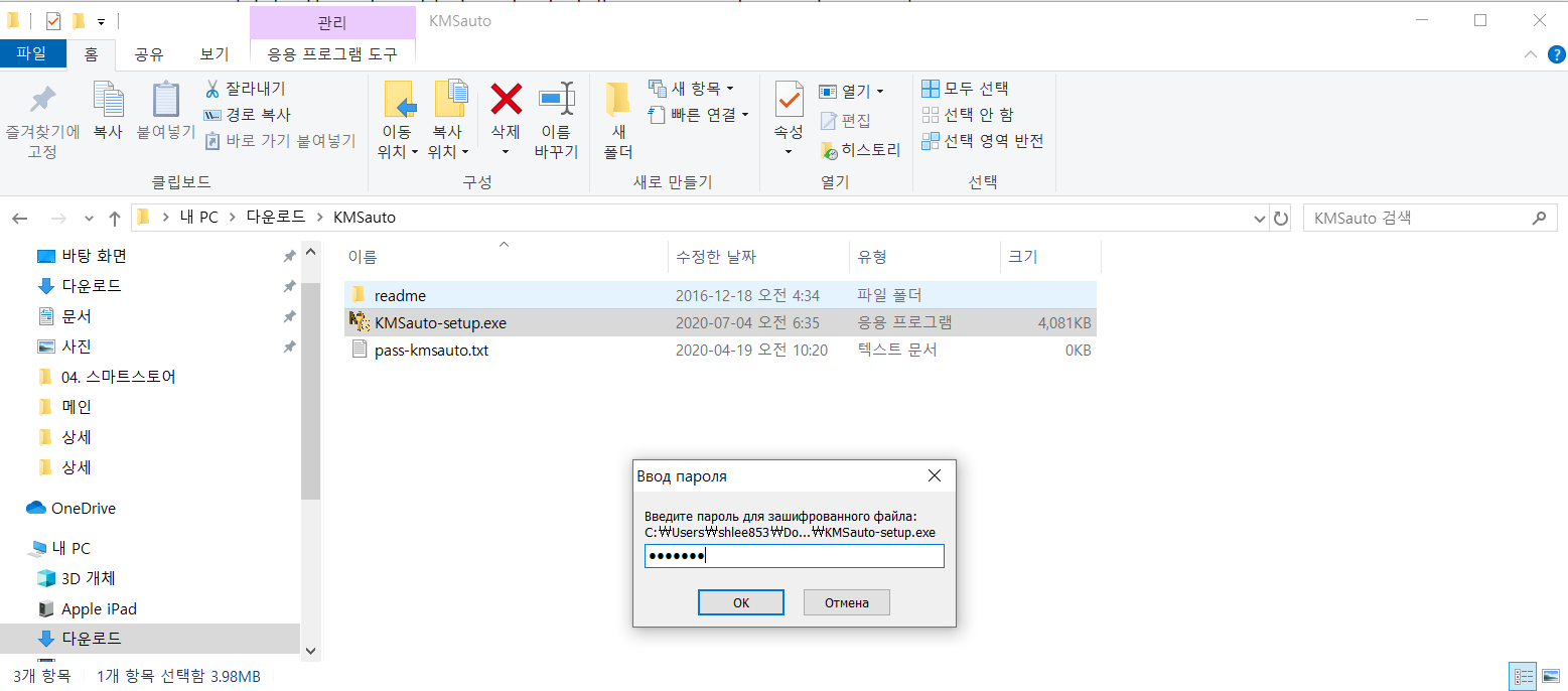 압축된 파일을 풀면 압축암호를 입력하도록 되어 있는데 kmsauto라고 입력하면 된다.