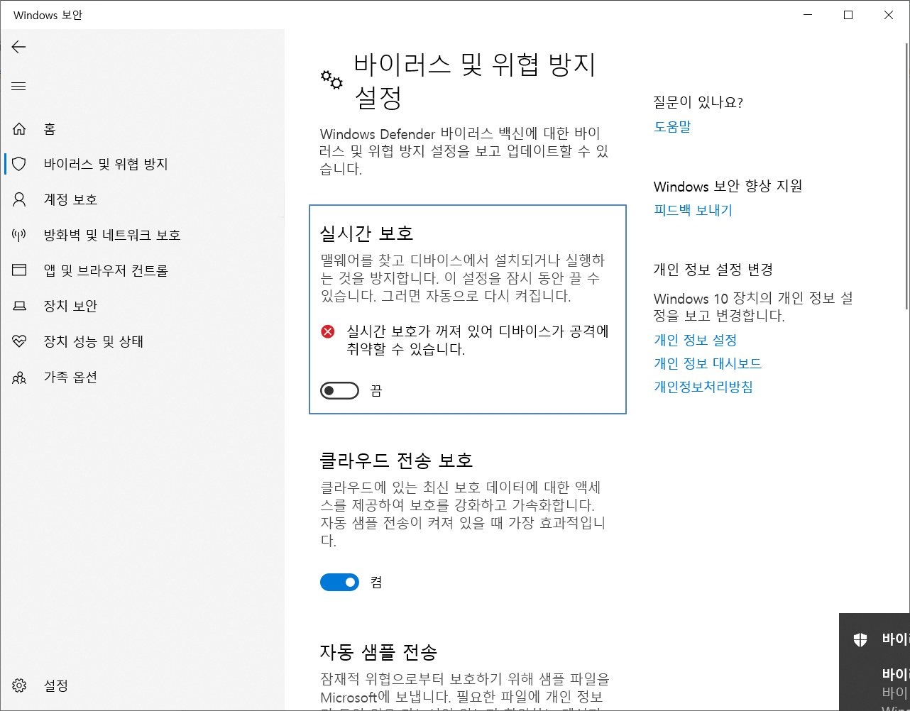 바이러스 및 위협 방지 설정에서 실시간 보호가 켜져 있으면 클릭해서 끔 상태로 변경해준다.