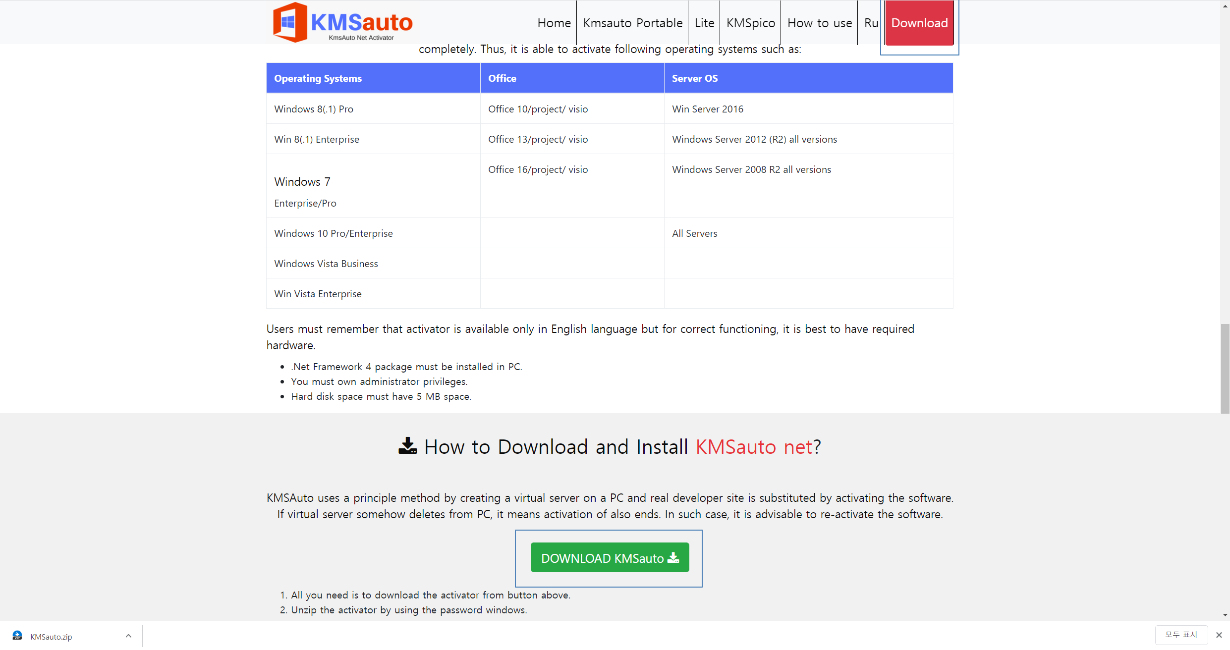 위 사이트로 들어가서 다운로드를 클릭한 후 아래쪽에 DOWNLOAD KMSauto를 눌러 파일을 다운받는다.