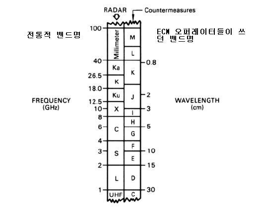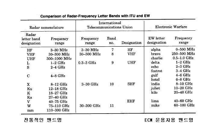 예컨대 전투기 레이다에 주로 사용되는 ECM 밴드명 기준의 I, J 밴드의 경우 전통적 밴드명 기준의 X, Ku 밴드하고 같은 주파수 대 입니다. 문자가 다르다고 다른 주파수 대역이 아니지요. 따라서 레이다 밴드 레터를 확인한 후에는 그것이 전통적 밴드명인지 아니면 ECM 밴드명인지 반드시 확인을 해야 혼동을 피할 수 있습니다. 아래 관련 그림을 참고하기 바랍니다.