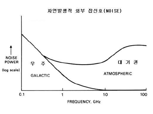 잡신호는 외부잡신호(자연적, 인공적)와 내부 잡신호(회로 내부를 흐르면서 발생하는)로 나뉘지요. 다른 레이다나 전파기기에서 나오는 인공적 외부 잡신호는 어쩔 수가 없고, 내부 잡신호는 회로 설계할 때 고려해야할 사안이지요. 결국 외부잡신호 문제가 남게 되는데, 자연적인 외부잡신호는 우주(galactic)에서 오는 것과 대기권에서 생긴 것으로 나눌 수 있습니다.
