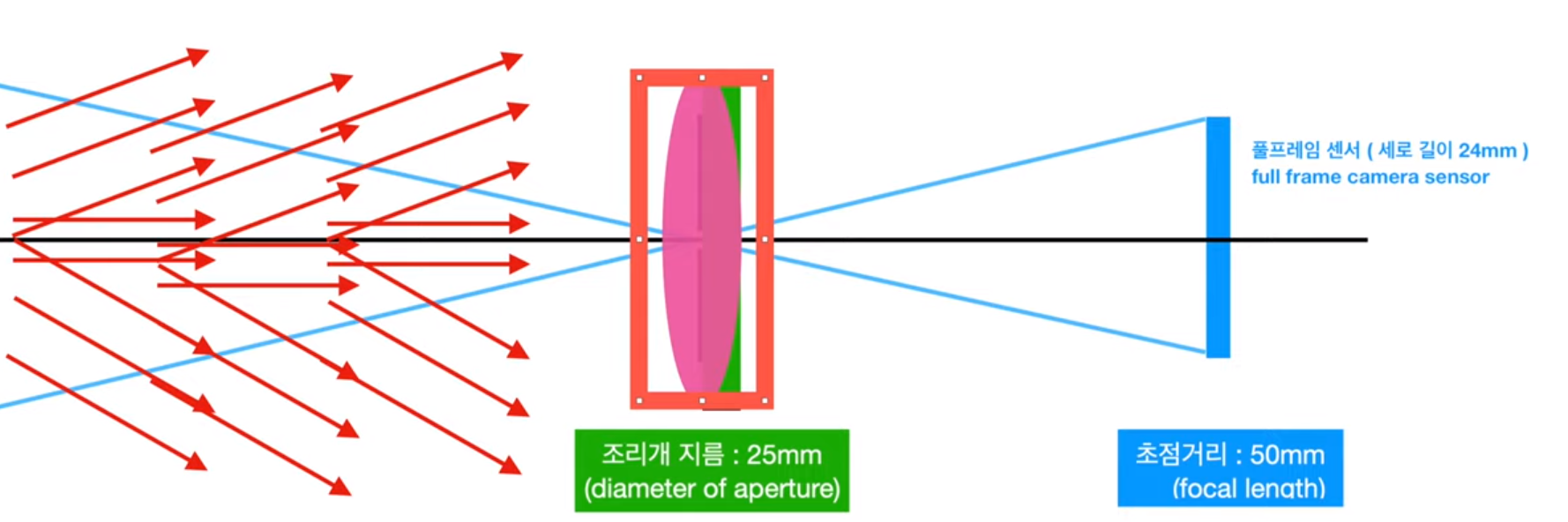 조리개 수치: 조리개에 대한 초점거리의 비율 focal length : D = F, fl * 1/F = D