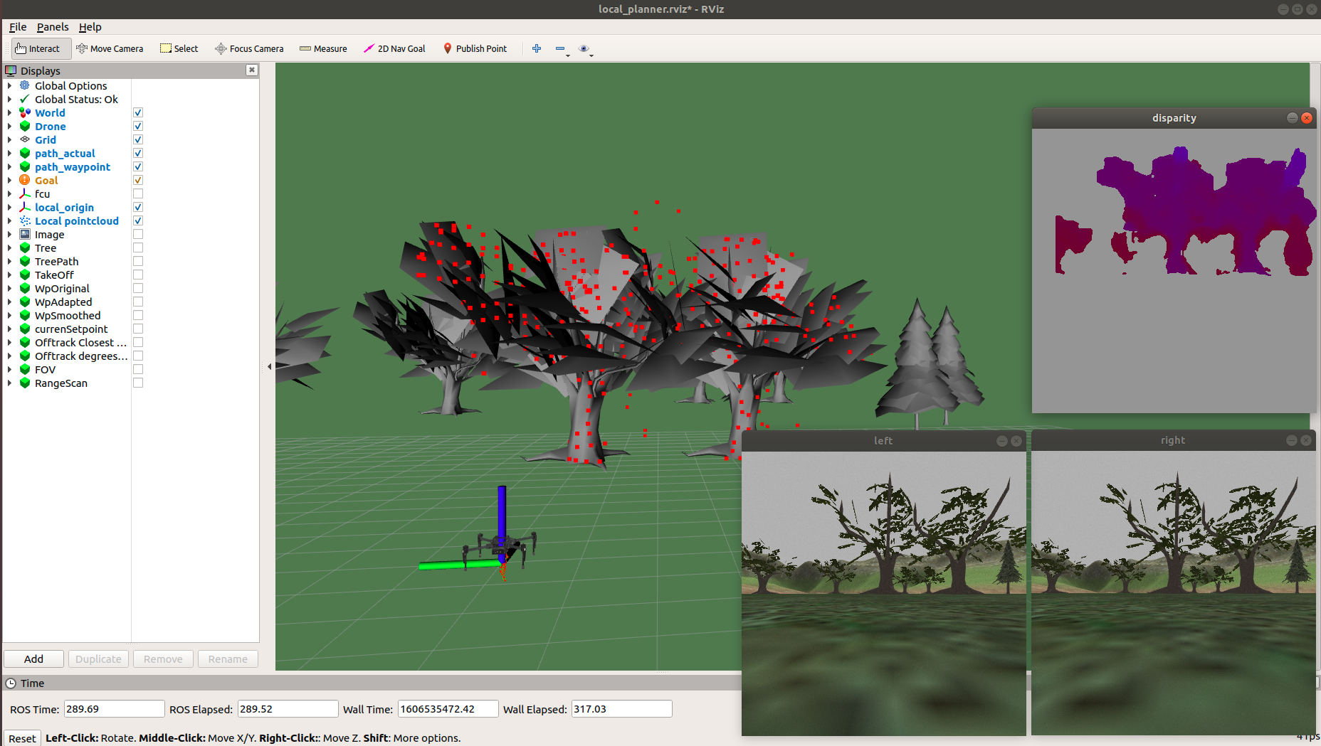 local_planner 실행파일을 구동시킨다. 시뮬레이션에서는 스테레오 카메라도 모의하기 위해서 local_planner_stereo.launch 도 함께 실행시킨다.