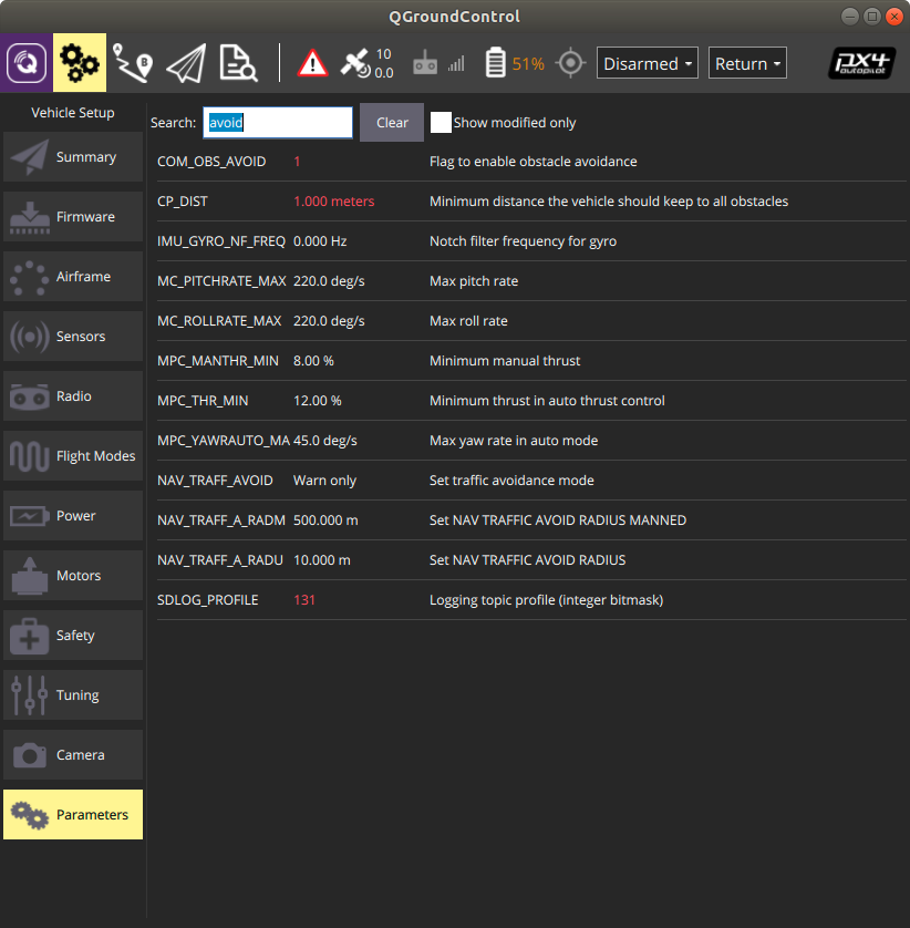 기능을 활성화하기 위해서 PX4 stack에서는 COM_OBS_AVOID 파라메터를 활성화해주어야 한다.