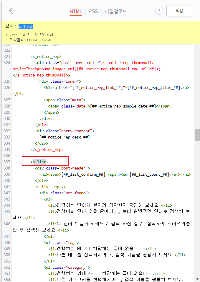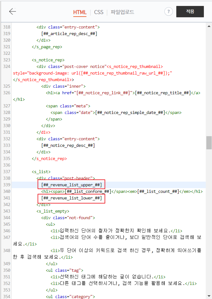 제가 사용하는 스킨은 목록 상단 치환자, 하단 치환자가 없기 때문에 HTML에서 입력하는 방법을 다루어 보도록 하겠습니다.