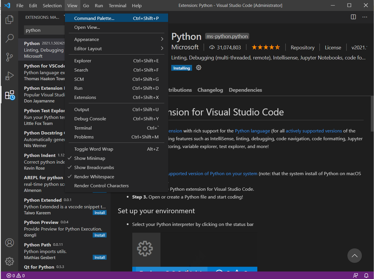 설치가 완료되면 Ctrl+Shift+P 또는 View-> Command Palette를 선택하고 입력창에서 'interpreter' 라고 입력한다.