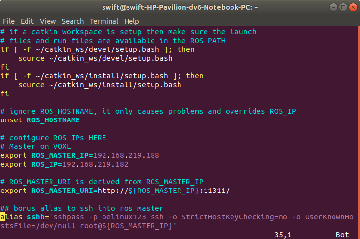 호스트에서는 아래와 같이 IP를 설정한다. 마스터는 VOXL의 IP가 되고 ROS_IP는 호스트의 IP를 입력한다.