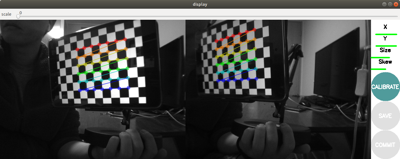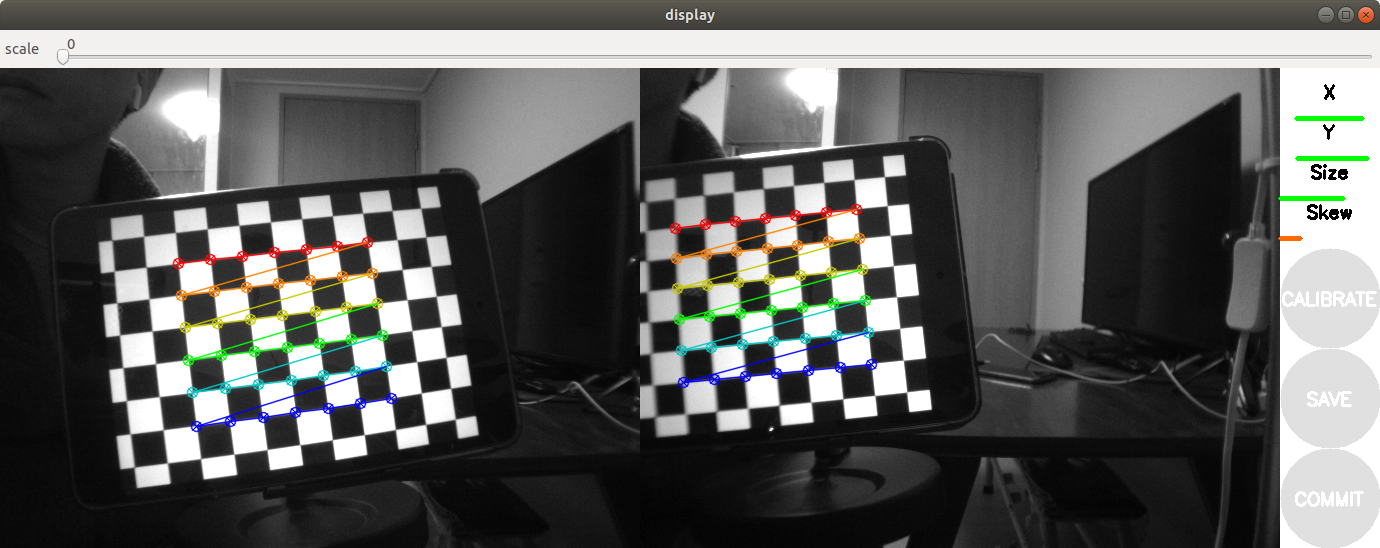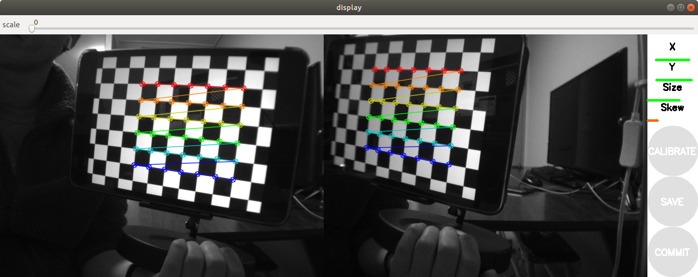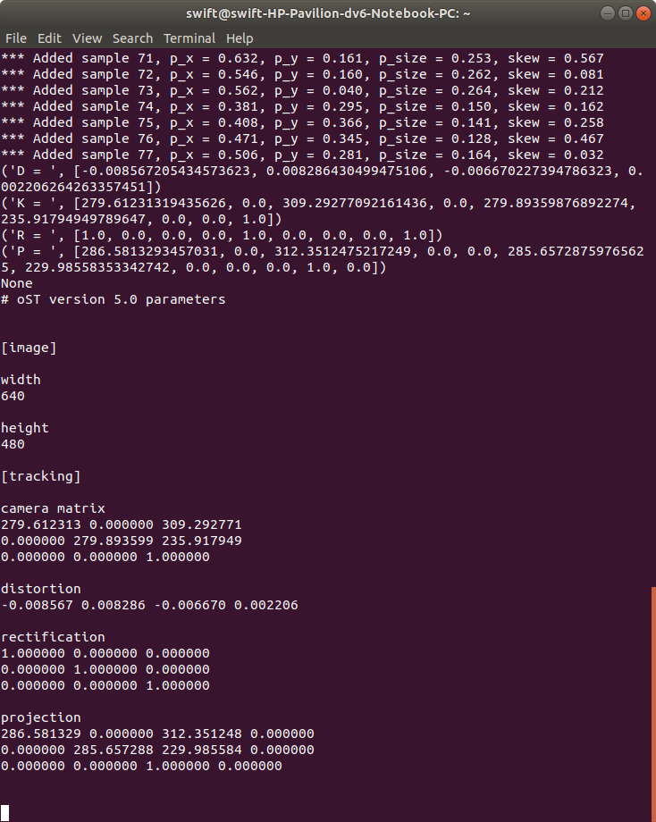 | CUSTOM CALIBRATOR, with ModalAI Fisheye Patch CUSTOM CALIBRATOR, with ModalAI Fisheye Patch *** Added sample 1, p_x = 0.320, p_y = 0.252, p_size = 0.190, skew = 0.084 *** Added sample 2, p_x = 0.169, p_y = 0.175, p_size = 0.192, skew = 0.124 *** Added sample 3, p_x = 0.472, p_y = 0.301, p_size = 0.211, skew = 0.015 *** Added sample 4, p_x = 0.820, p_y = 0.472, p_size = 0.556, skew = 0.036 *** Added sample 5, p_x = 0.505, p_y = 0.552, p_size = 0.640, skew = 0.154 *** Added sample 6, p_x = 0.513, p_y = 0.510, p_size = 0.348, skew = 0.029 *** Added sample 7, p_x = 0.609, p_y = 0.878, p_size = 0.369, skew = 0.026 *** Added sample 8, p_x = 0.545, p_y = 0.616, p_size = 0.308, skew = 0.203 *** Added sample 9, p_x = 0.422, p_y = 0.578, p_size = 0.318, skew = 0.080 *** Added sample 10, p_x = 0.470, p_y = 0.695, p_size = 0.351, skew = 0.036 *** Added sample 11, p_x = 0.459, p_y = 0.222, p_size = 0.412, skew = 0.037 *** Added sample 12, p_x = 0.638, p_y = 0.576, p_size = 0.359, skew = 0.096 *** Added sample 13, p_x = 0.525, p_y = 0.400, p_size = 0.349, skew = 0.158 *** Added sample 14, p_x = 0.492, p_y = 0.276, p_size = 0.363, skew = 0.207 *** Added sample 15, p_x = 0.452, p_y = 0.380, p_size = 0.378, skew = 0.029 *** Added sample 16, p_x = 0.778, p_y = 0.349, p_size = 0.224, skew = 0.381 *** Added sample 17, p_x = 0.888, p_y = 0.292, p_size = 0.211, skew = 0.502 *** Added sample 18, p_x = 0.777, p_y = 0.321, p_size = 0.352, skew = 0.177 *** Added sample 19, p_x = 0.633, p_y = 0.236, p_size = 0.305, skew = 0.194 *** Added sample 20, p_x = 0.540, p_y = 0.233, p_size = 0.273, skew = 0.281 *** Added sample 21, p_x = 0.815, p_y = 0.854, p_size = 0.384, skew = 0.595 Stero Calibration, calculating left intrinsics 00:23:46.392537 Using instrinsic guess Stero Calibration, calculating right intrinsics 00:23:47.925835 Using instrinsic guess Stero Calibration, calculating extrinsics 00:23:49.918648 00:23:50.043990 Left: ('D = ', [-0.18831103077255, 0.09979392881997494, -0.001874558763111393, -0.003364828044223498, 0.0]) ('K = ', [496.4483869872976, 0.0, 318.13194222244135, 0.0, 496.00455632506436, 254.98228876117963, 0.0, 0.0, 1.0]) ('R = ', [0.7135620220051729, -0.006748466471476072, -0.7005595613166465, 0.012939598040397899, 0.9999099864063884, 0.0035476594155846837, 0.7004725601723752, -0.011596434152765206, 0.7135851141668375]) ('P = ', [7599.160763622445, 0.0, 1265.467307806015, 0.0, 0.0, 7599.160763622445, 232.83489227294922, 0.0, 0.0, 0.0, 1.0, 0.0]) Right: ('D = ', [-0.18074431297879, 0.09867497473634164, -0.0009884954467132986, 0.0036353564073705403, 0.0]) ('K = ', [498.7409883267622, 0.0, 291.5762187032763, 0.0, 498.30987684184066, 227.68080990553125, 0.0, 0.0, 1.0]) ('R = ', [0.7615991377315566, 0.058995280645396275, -0.645357505781191, -0.06461826976319257, 0.9977979698625183, 0.01495628801033251, 0.6448187595125938, 0.030311189349936044, 0.7637342464370913]) ('P = ', [7599.160763622445, 0.0, 1265.467307806015, -1711.1482708710546, 0.0, 7599.160763622445, 232.83489227294922, 0.0, 0.0, 0.0, 1.0, 0.0]) ('self.T ', [-0.17149381203576658, -0.01328431857227886, 0.14531899172307178]) ('self.R ', [0.9942899335632859, -0.07722967777136173, -0.07364173331778835, 0.07624005280745842, 0.9969585250967534, -0.016160247053250816, 0.07466580450669887, 0.010453521331962081, 0.997153820395394]) None # oST version 5.0 parameters [image] width 640 height 480 [stereo/left] camera matrix 496.448387 0.000000 318.131942 0.000000 496.004556 254.982289 0.000000 0.000000 1.000000 distortion -0.188311 0.099794 -0.001875 -0.003365 0.000000 rectification 0.713562 -0.006748 -0.700560 0.012940 0.999910 0.003548 0.700473 -0.011596 0.713585 projection 7599.160764 0.000000 1265.467308 0.000000 0.000000 7599.160764 232.834892 0.000000 0.000000 0.000000 1.000000 0.000000 # oST version 5.0 parameters [image] width 640 height 480 [stereo/right] camera matrix 498.740988 0.000000 291.576219 0.000000 498.309877 227.680810 0.000000 0.000000 1.000000 distortion -0.180744 0.098675 -0.000988 0.003635 0.000000 rectification 0.761599 0.058995 -0.645358 -0.064618 0.997798 0.014956 0.644819 0.030311 0.763734 projection 7599.160764 0.000000 1265.467308 -1711.148271 0.000000 7599.160764 232.834892 0.000000 0.000000 0.000000 1.000000 0.000000 |