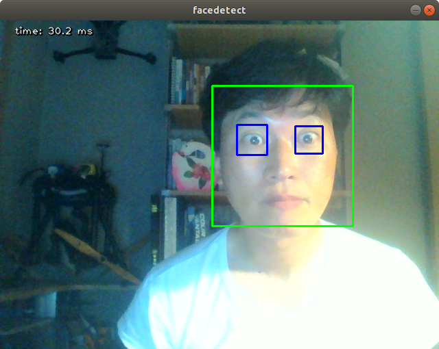 결과는 아래 그림처럼 얼굴 영역과 눈을 찾아 박싱으로 표시해줍니다.