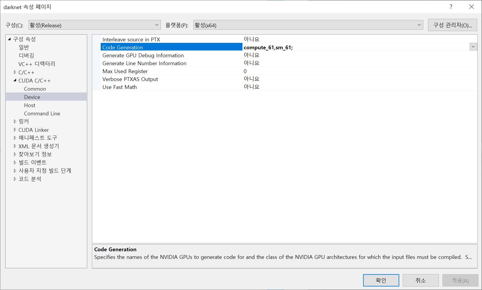 프로젝트 -> 속성-> CUDA C/C++ -> Code Generation을 선택하고 오른쪽 탭을 눌러 편집을 선택한다.