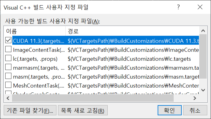 Visual C++ 빌드 사용자 지정 파일에서 CUDA 11.3을 선택한다.