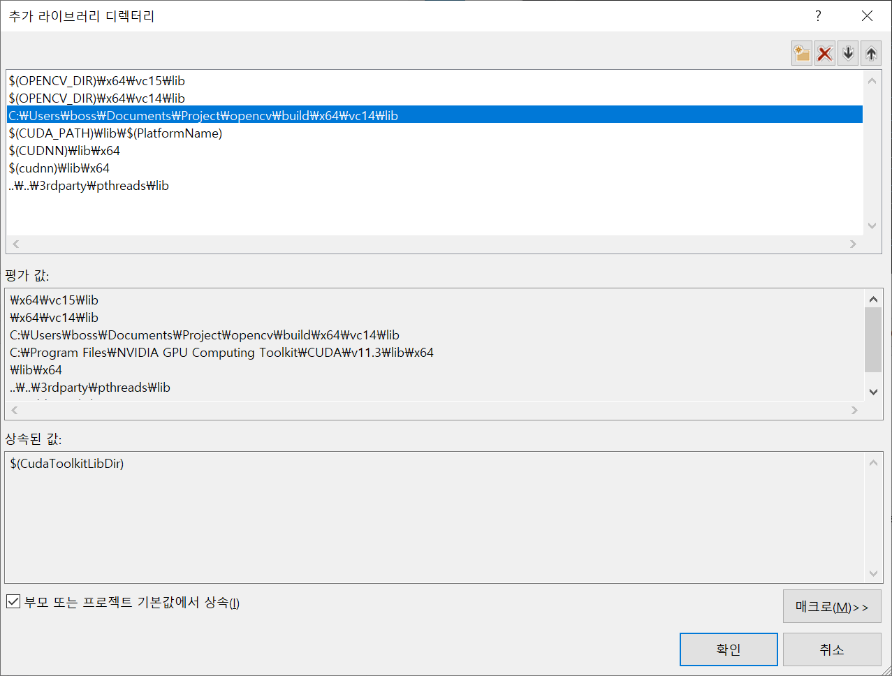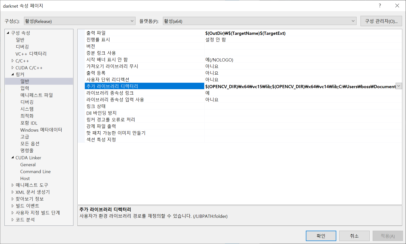 마찬가지로 opencv의 lib 대한 경로를 확인하여 수정해준다.