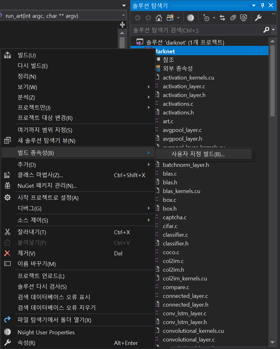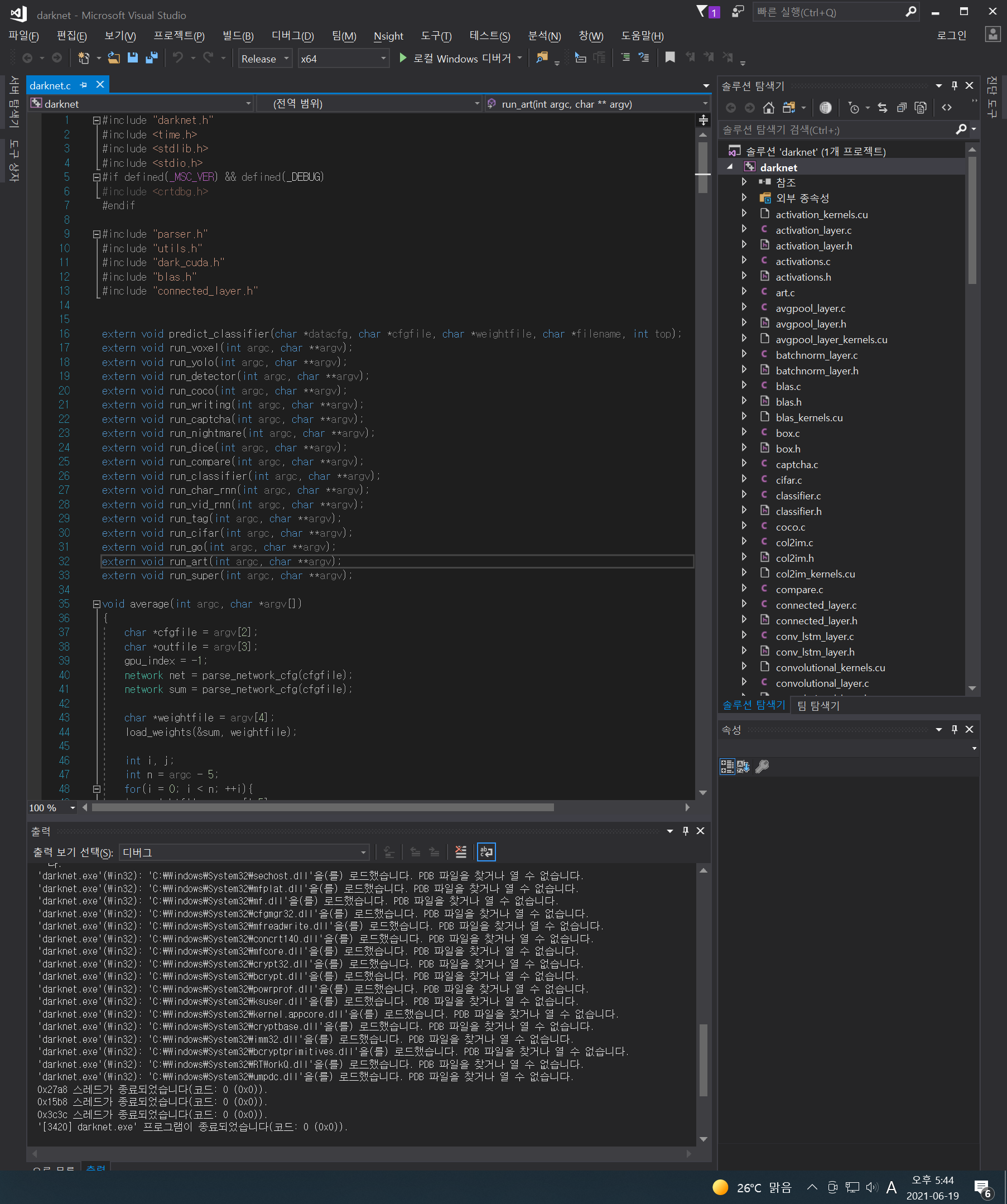 darknet 프로젝트에서 darknet.sln 파일을 실행하여 Visual Studio에 프로젝트를 로딩한다.