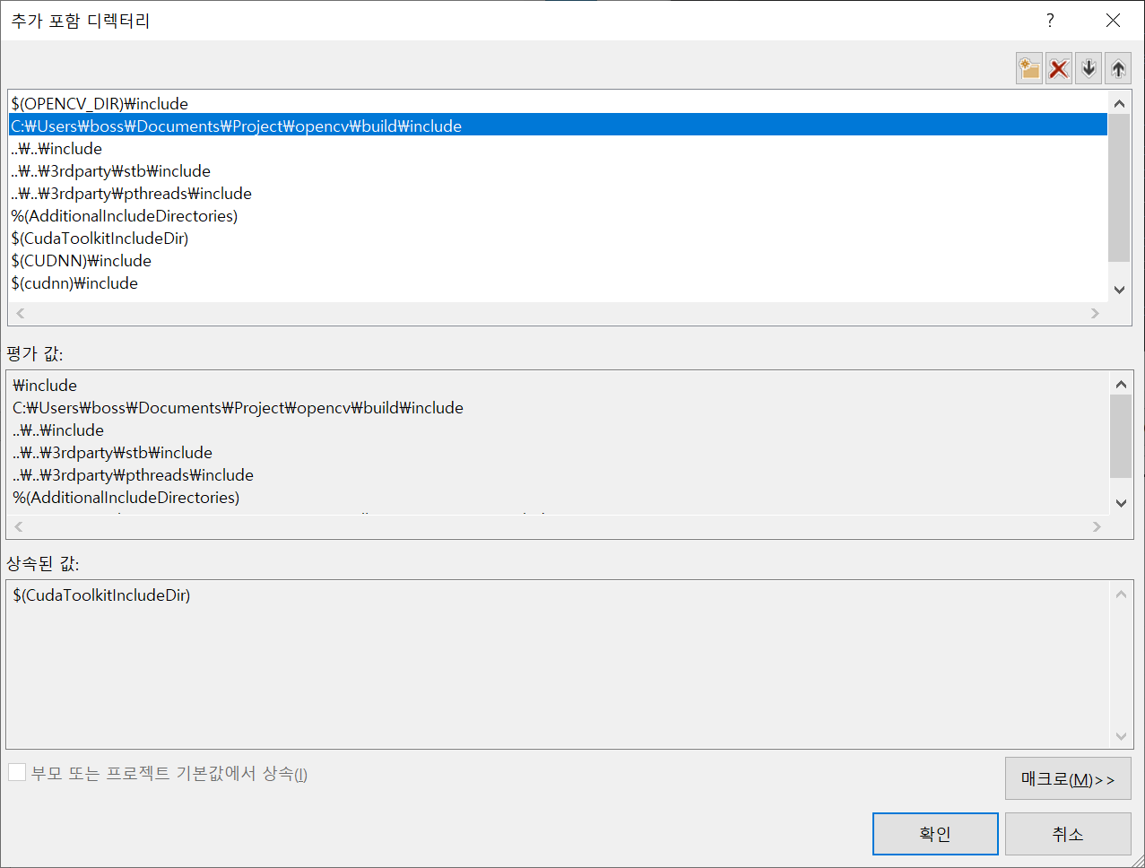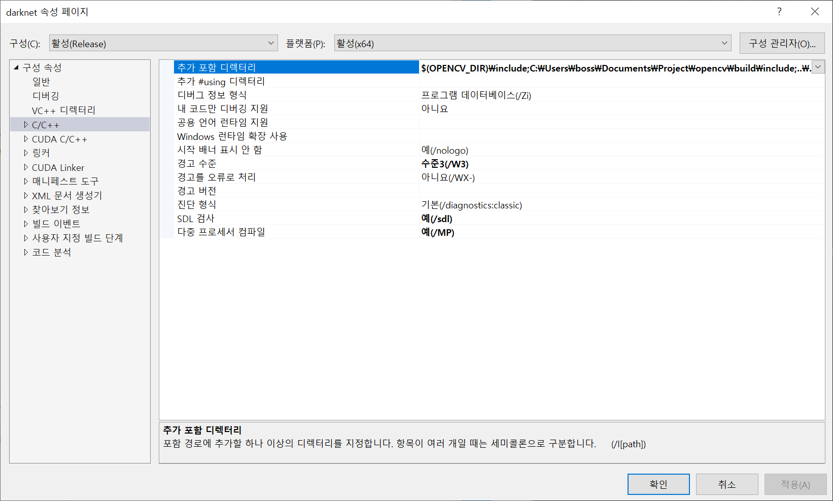 opencv에 대한 경로를 현재 다운로드 받은 opencv의 include가 있는 경로를 확인하여 수정해준다.