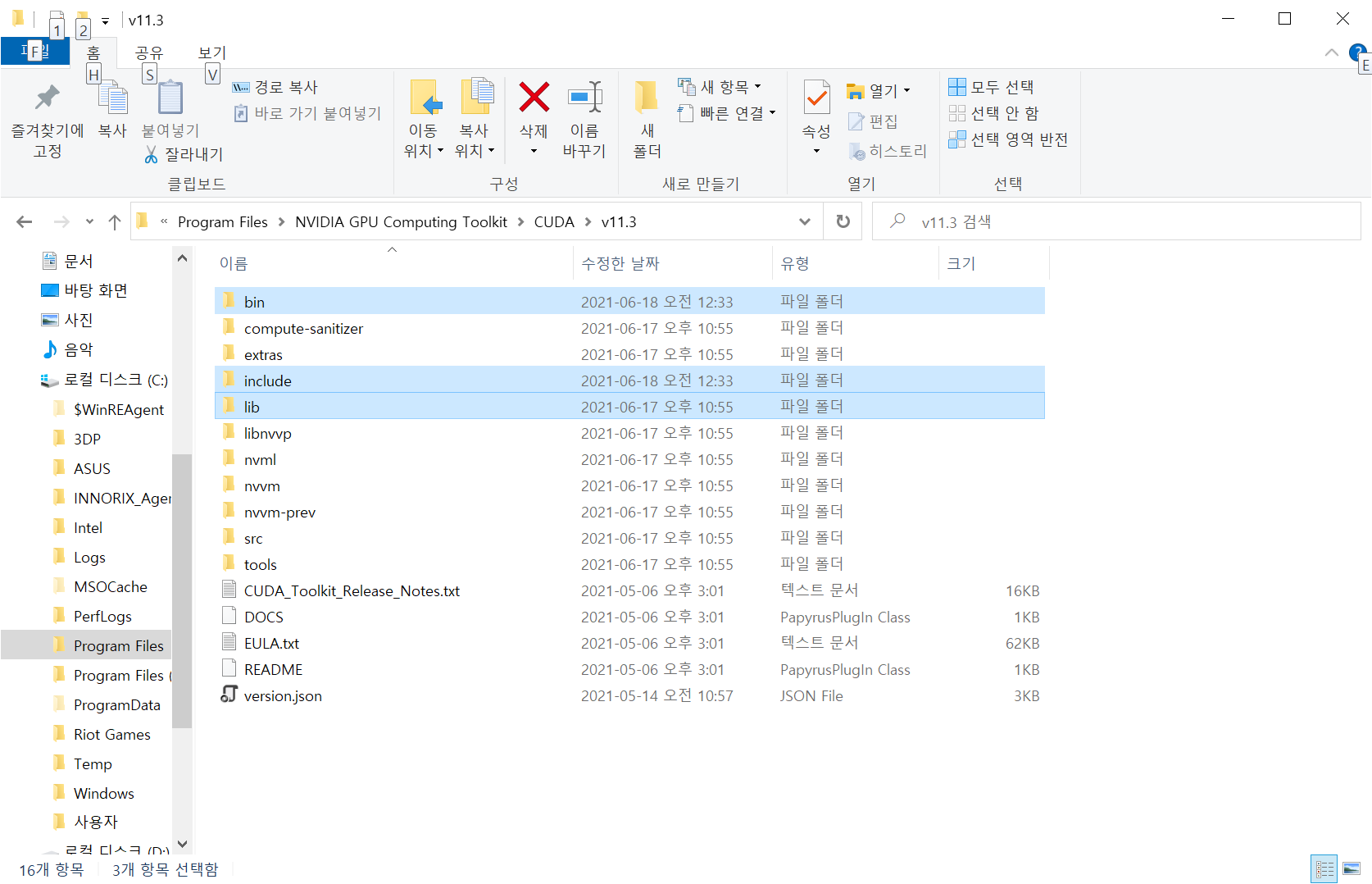 다운받은 파일의 압축을 풀고 아래 세 폴더의 파일들을 CUDA가 설치된 경로의 같은 이름의 하위폴더에 각각 복사해준다.