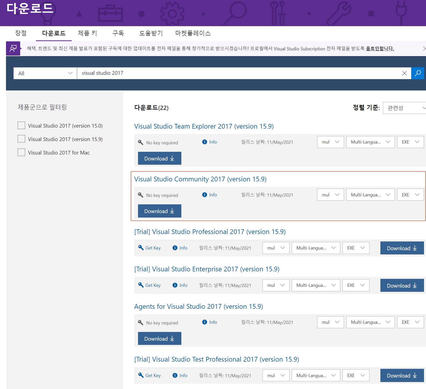 다운로드 페이지에서 무료 사용이 가능한 Vusial Studio Community 2017를 선택하여 설치하였다.