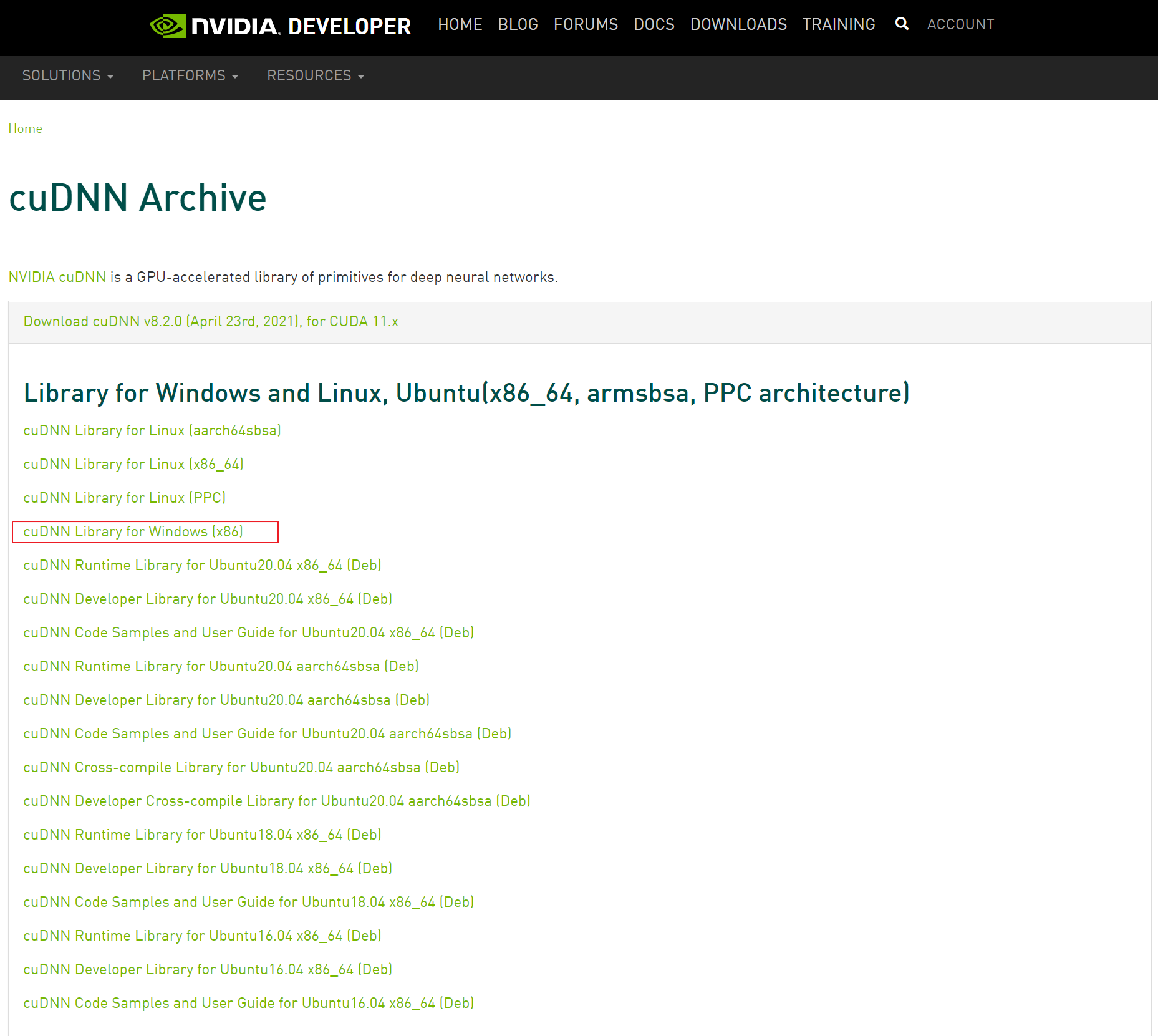 CUDA 11.3 과 매칭되는 버전이 v8.2 이므로 v8.2 중에서도 cnDNN Library for Windows(x86)을 선택한다.