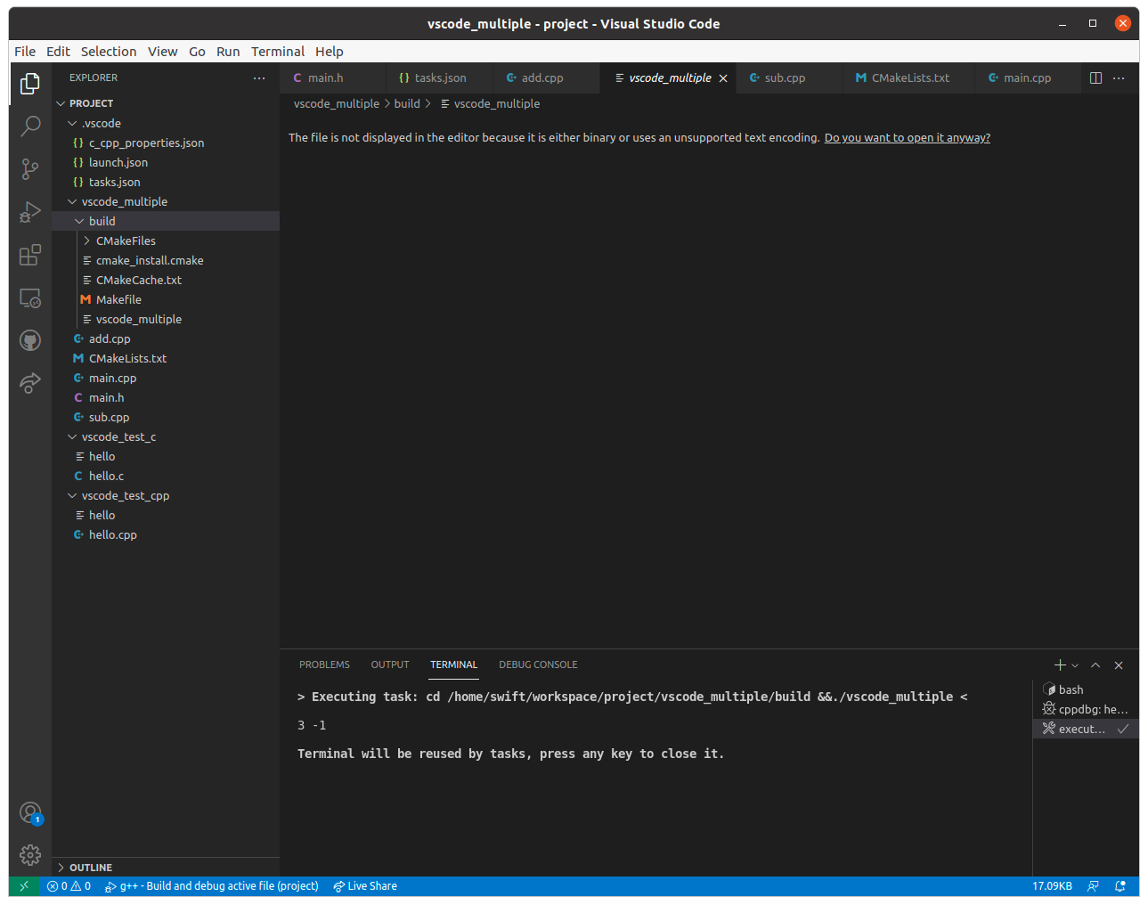 Terminal -> Run Task를 선택하고 그 중 이번에 추가한 cmake and make build를 선택한다. 아래 그림과 같이 프로젝트 경로상에 build폴더가 만들어지고 그 안에 Makfile 및 Excutable 파일이 생성된다.
