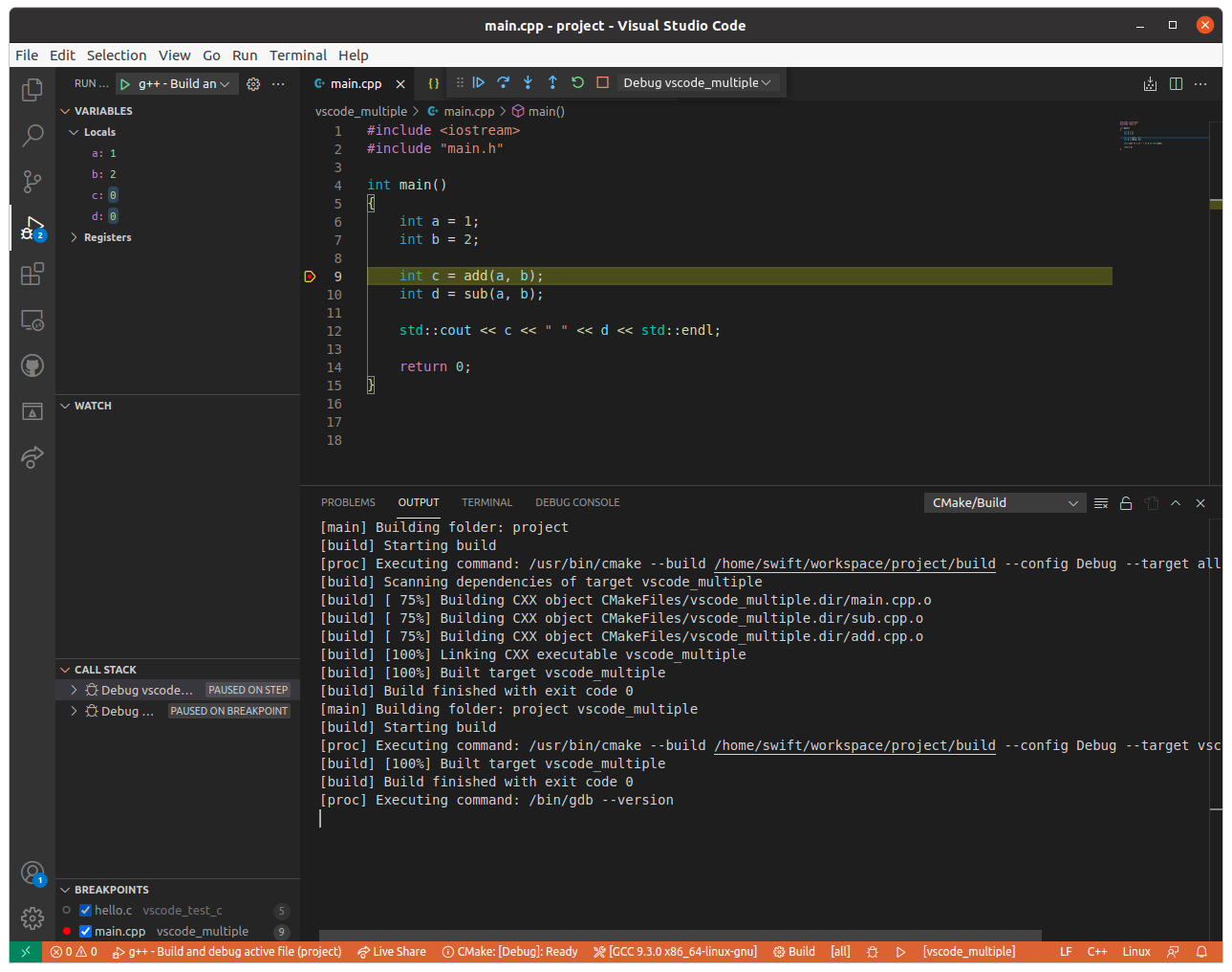 디버깅도 마찬가지로 팔레트를 이용하여 쉽게 할 수 있다. 팔레트에서 CMake:Debug 를 실행하면 break point에서 현재 상태와 변수값들을 제시해준다.