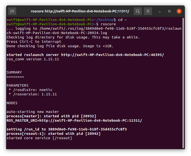 여기까지 모두 설치가 되었으면 roscore를 실행해본다. 서버가 정상적으로 실행되는 것 확인할 수 있다.