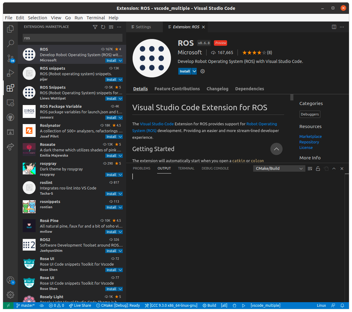Ctrl+Shift + X를 눌러 ros 를 검색하여 플러그인을 설치한다.