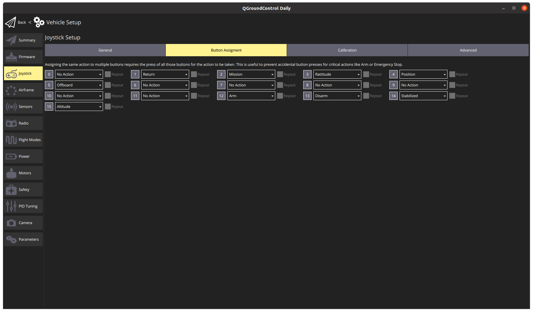 조이스틱의 USB를 연결하고 QGRoundControl에서 Vehicle Setup에 들어가면 Joystick이 자동으로 활성화됩니다. 자동으로 조이스틱의 모델이 인식됩니다. RC Mode는 조종기의 모드를 말합니다. 보통 요즘에는 모드2를 많이 사용하므로 모드2로 선택하였습니다.