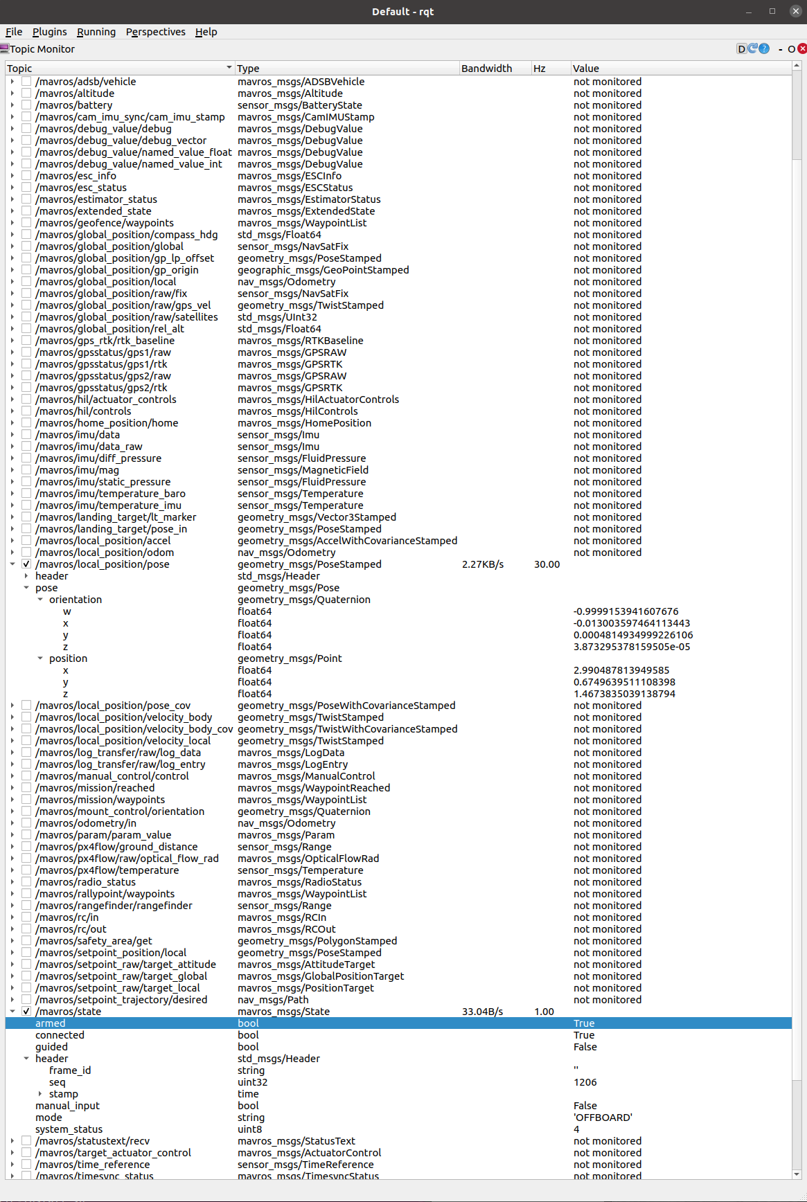 offboard 모드에서 주는 정보는 geometry_msgs의 pose 값을 계속해서 넘겨줍니다. 이 값은 드론의 3 차원 position 및 quternion 사원수값을 가지고 있습니다.