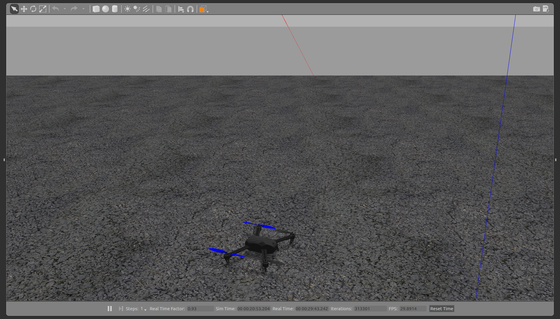 지난 번에 Gazebo 환경에서 IRIS 모델을 SITL로 구축해보았다. 오늘 QGRoundControl도 Gazebo가 연결되어 있는 상황에서 실행하는 것이므로 미리 빌드가 되어 아래 화면과 같이 Gazebo에서 IRIS 모델이 로딩되어야 한다.