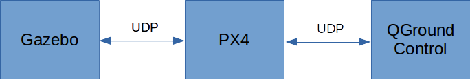 아래 그림처럼 서로 UDP로 연동되어 있다. PX4는 서로 UDP로 QGroundControl과 Gazebo와 연결되어 있고 제어 명령을 받고 상태정보를 전송해는 방법으로 연동한다.
