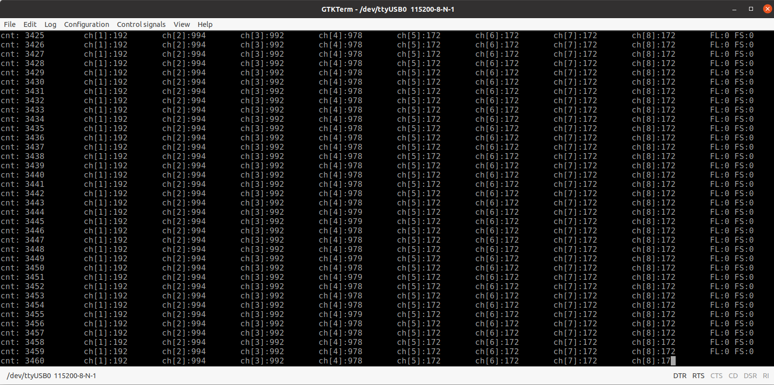 SBUS로 수신된 데이터를 Parsing 하여 채널데이터로 출력해보면 아래와 같이 나타난다.