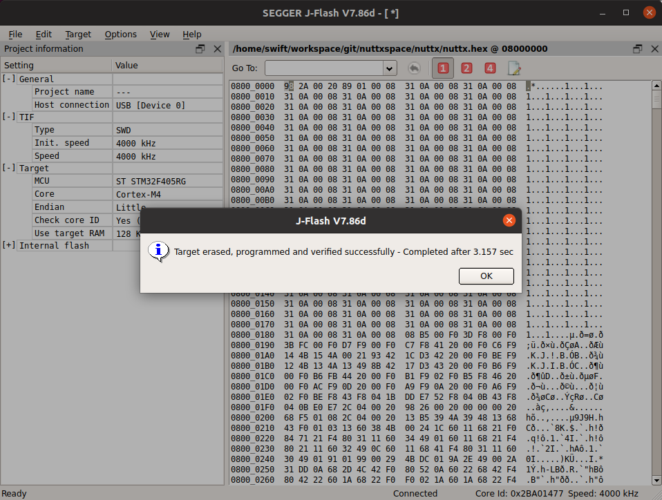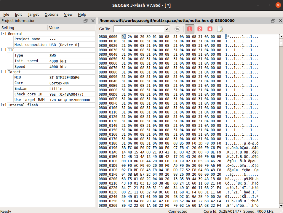 - 방금 nuttx 빌드한 폴더를 찾아가서 nuttx.hex 또는 nuttx.bin 파일을 드래그하여 JFlashExe 프로그램으로 가져온다. 0x08000000부터 파일의 내용이 보이기 시작하고 실제로 플래시하게되면 해당 영역에 파일을 그대로 플래시한다.