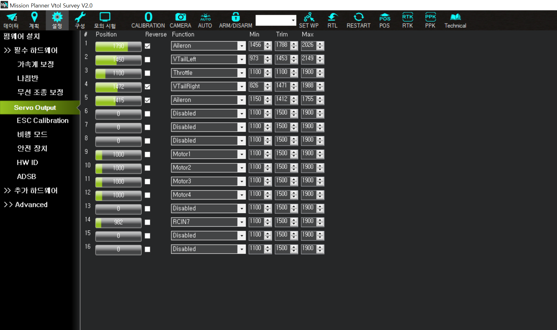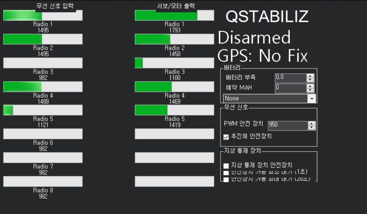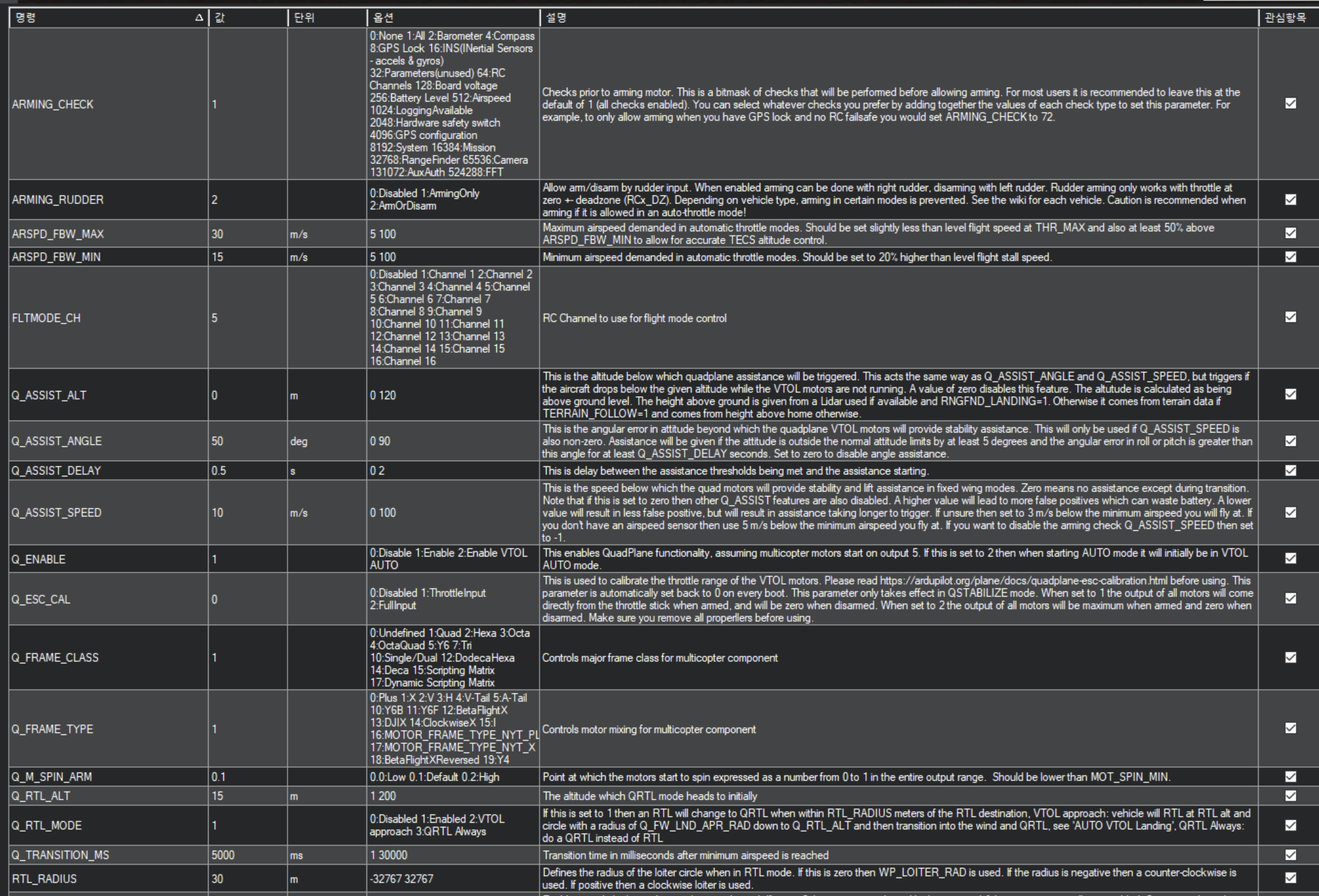 - Q_ESC_CAL=1, Q_SPIN_MIN=0, PREARM_CHECK = 0, Rudder로 Armming할 수 있도록 수정으로 수정