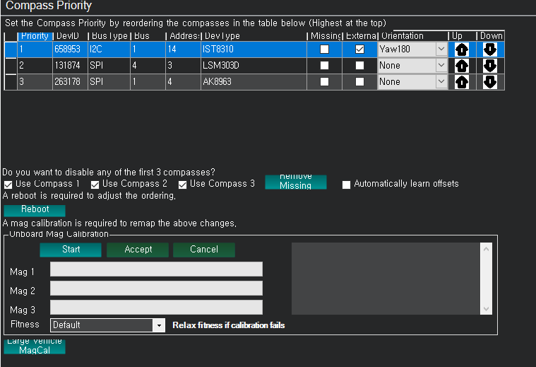 - 외부는 LIS3MDL 센서를 사용함, 외부센서는 180도 회전되어 설치되어 있으므로 Orientation Yaw180 적용해주어야 함