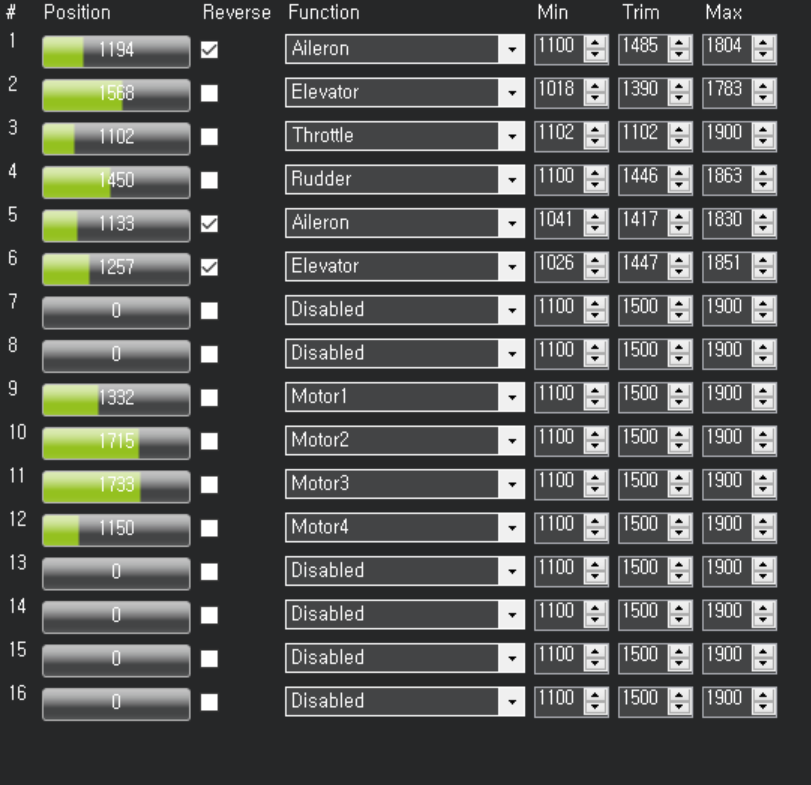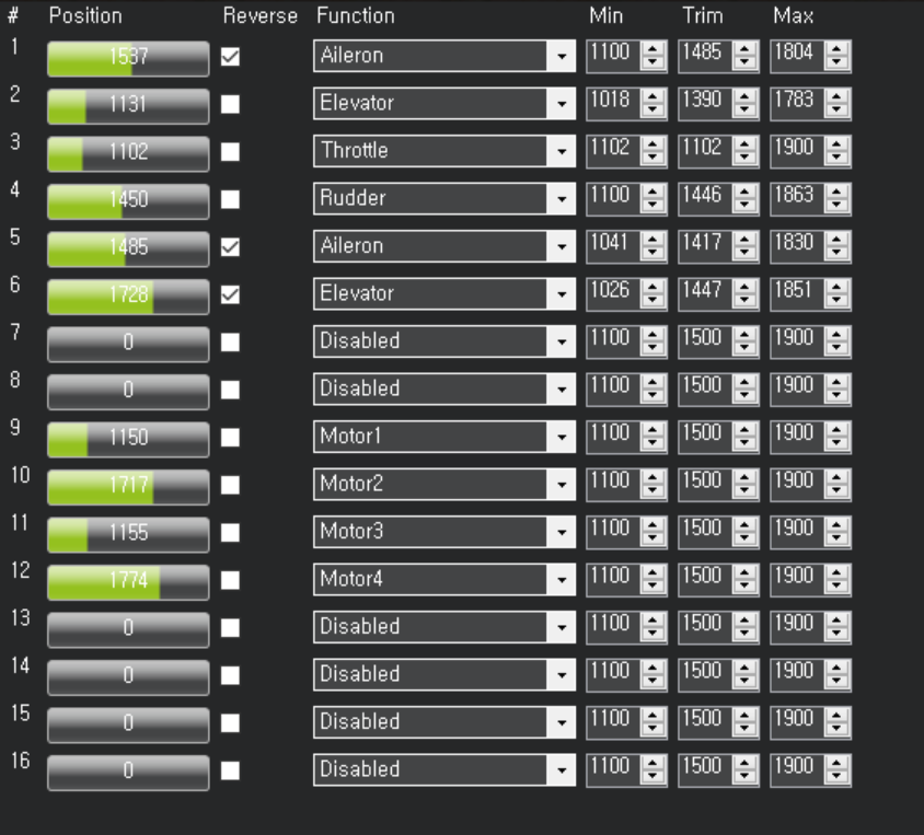 - Rudder +방향(조종기의 Rudder키를 오른쪽)으로 전환시 1,2번 모터 출력이 3,4번보다 높아야 함