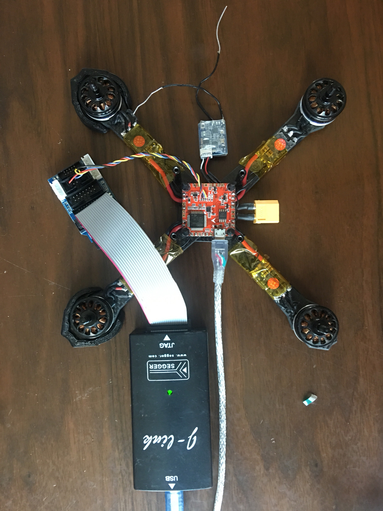 아래 사진은 본인이 Revolt FC를 이용하여 제작한 Racing Drone이다. 펌웨어 개발을 위해 SWD 신호선을 J-Link 에뮬레이터와 연결하였다.