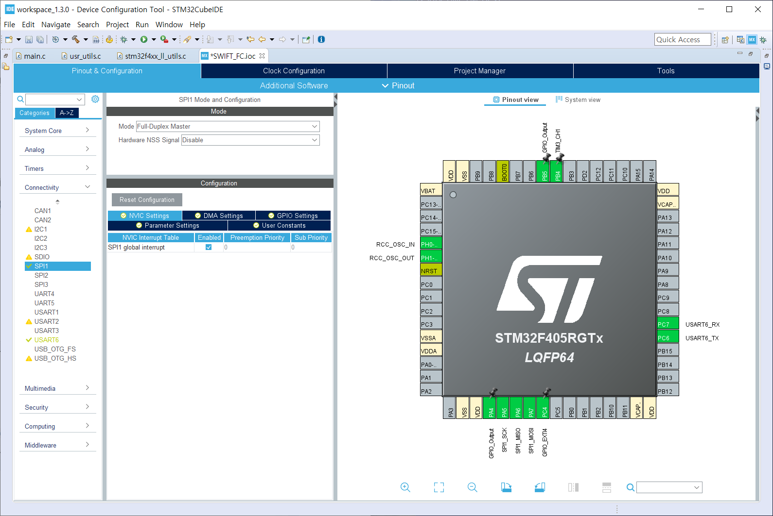 STM32F405는 ICM-20602 IMU센서와 SPI로 연결된다. ICM-20602는 SPI 통신과 I2C 통신 두가지 방식을 지원하는데 SPI가 속도가 훨씬 빠르다. 통신방식의 결정은 CS핀이 Low일때 SPI 모드로 통신하게 된다. 데이터를 가져오는 방식을 인터럽트 방식으로 하기 위해 외부 GPIO 인터럽트를 활성화해주어야 한다.